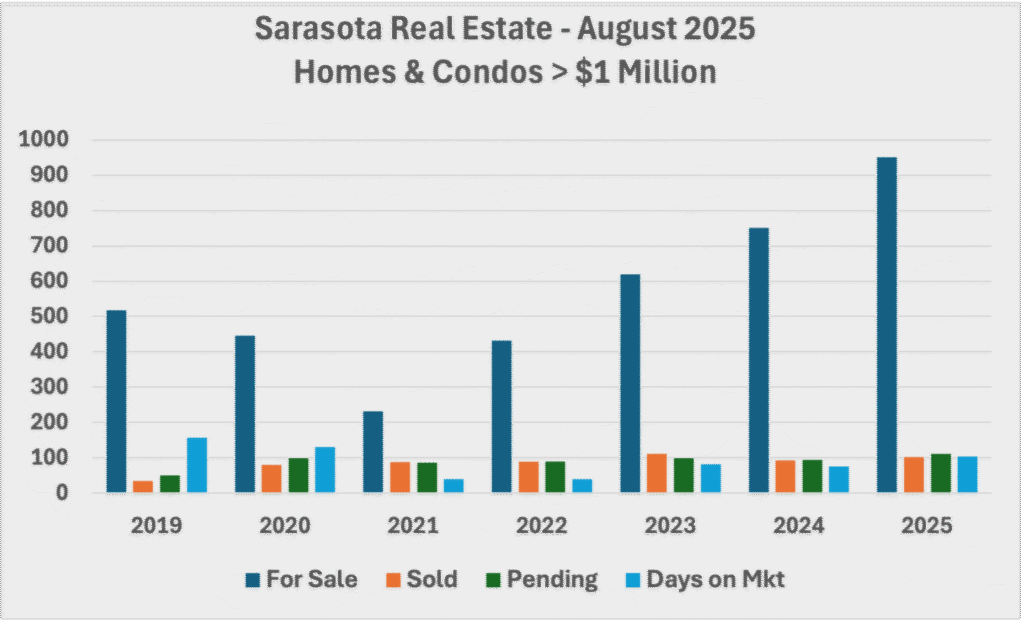 Below is a snapshot using data compiled from the Florida Association of Realtors showing August’s existing property market activity over $1,000,000 compared to prior year: