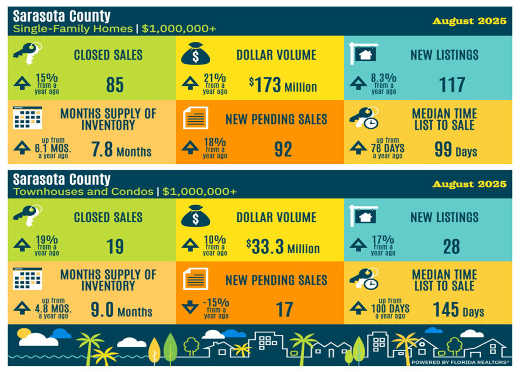 - Florida’s homes sold for more than $1 million were 7.3% higher than August 2024 and condos closed at over $1 million fell 3.8%.