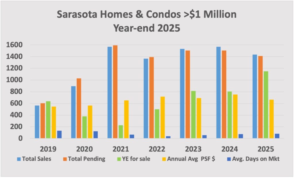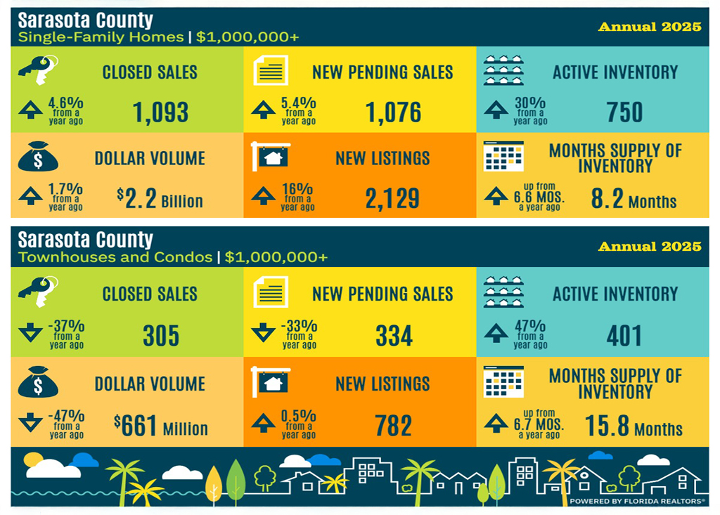 Below is a snapshot using data compiled from the Florida Association of Realtors showing Year-End 2025 existing property market activity over $1,000,000 compared to prior year: