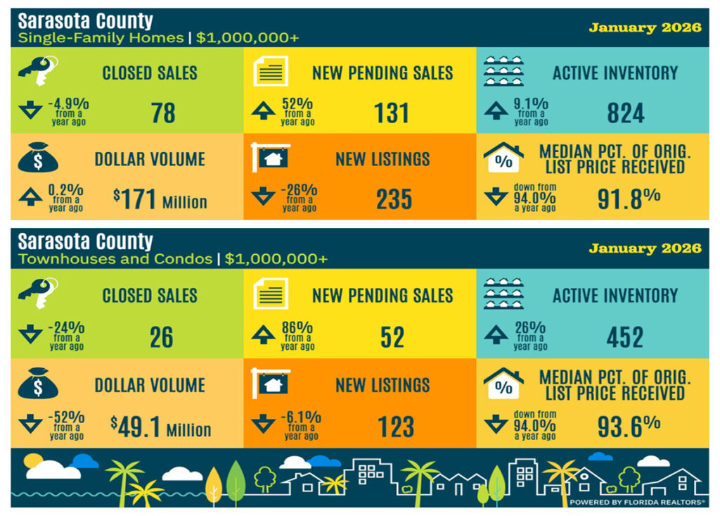 Below is a snapshot using data compiled by the Florida Association of Realtors showing January 2026 existing market activity for properties over $1 Million compared to prior year