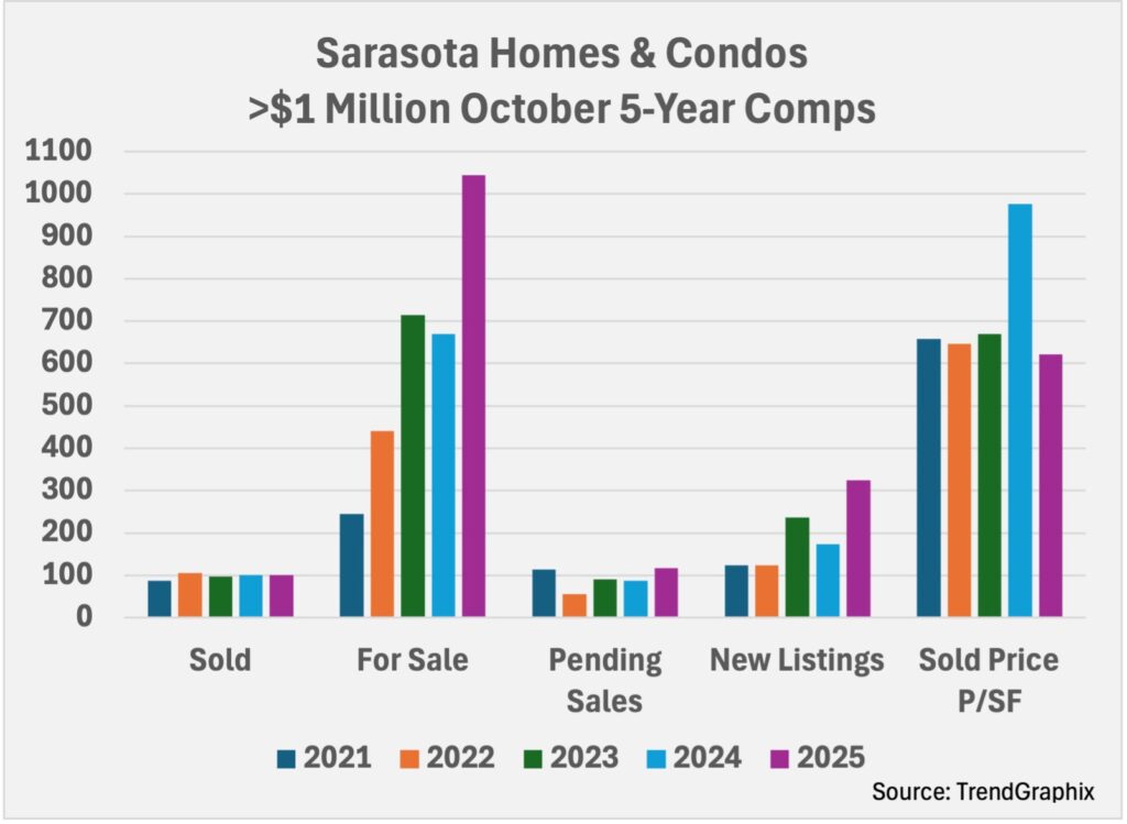 - The Sarasota market had 1,590 new listings in the past month. The market averaged 1,485 new listings monthly this year, 1,391 in 2024, 1,318 in 2023 and 904 in 2022.