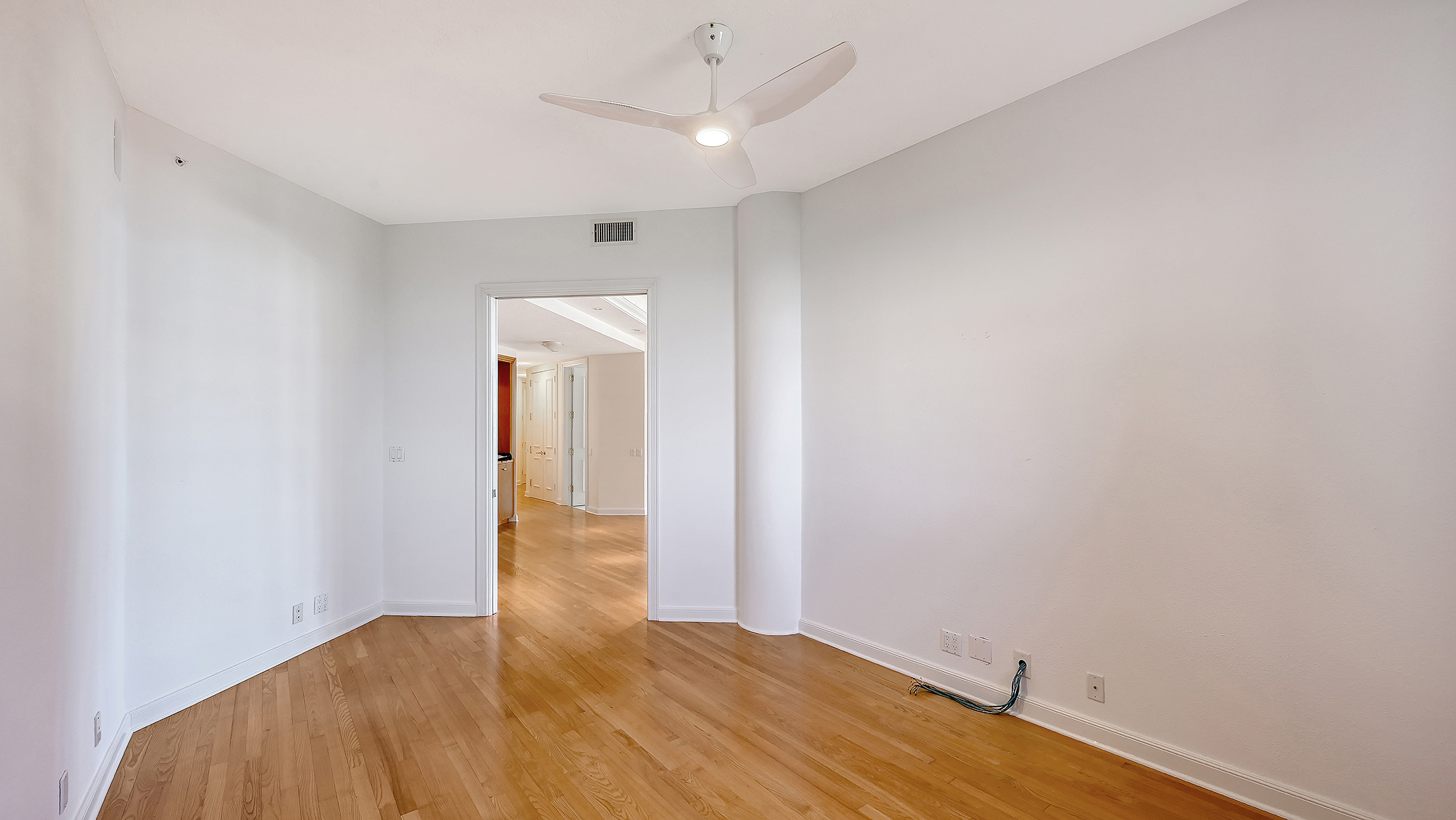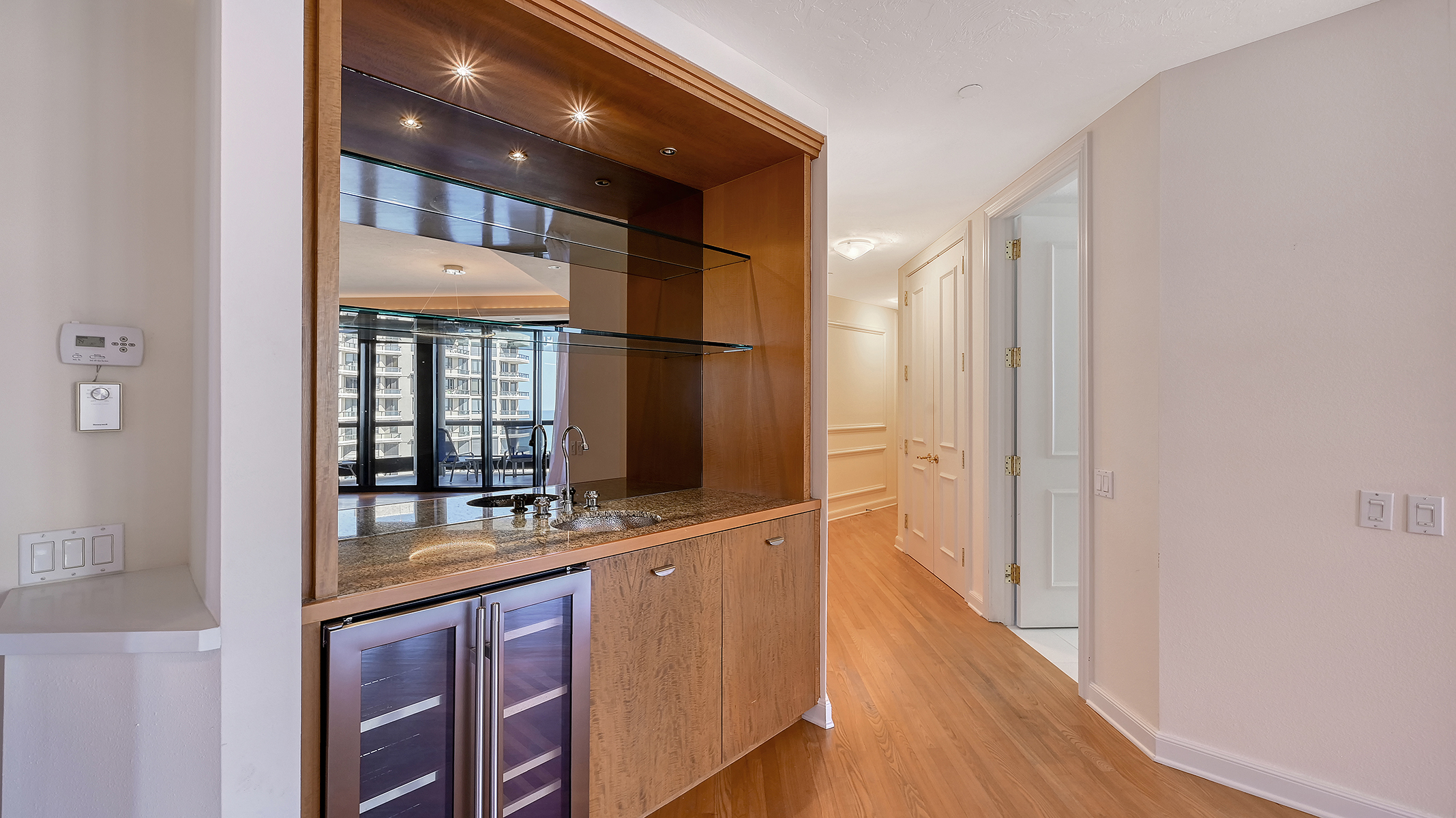 Residents benefit from a semi-private elevator that opens directly into an impressive foyer, offering sweeping views of Sarasota Bay and the city skyline through floor-to-ceiling windows. This residence is on the north side of the south building, the sunset view side, overlooking the beautiful pool deck amenity of the community.