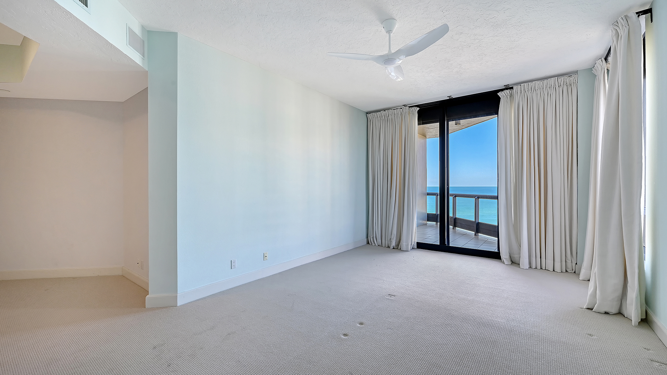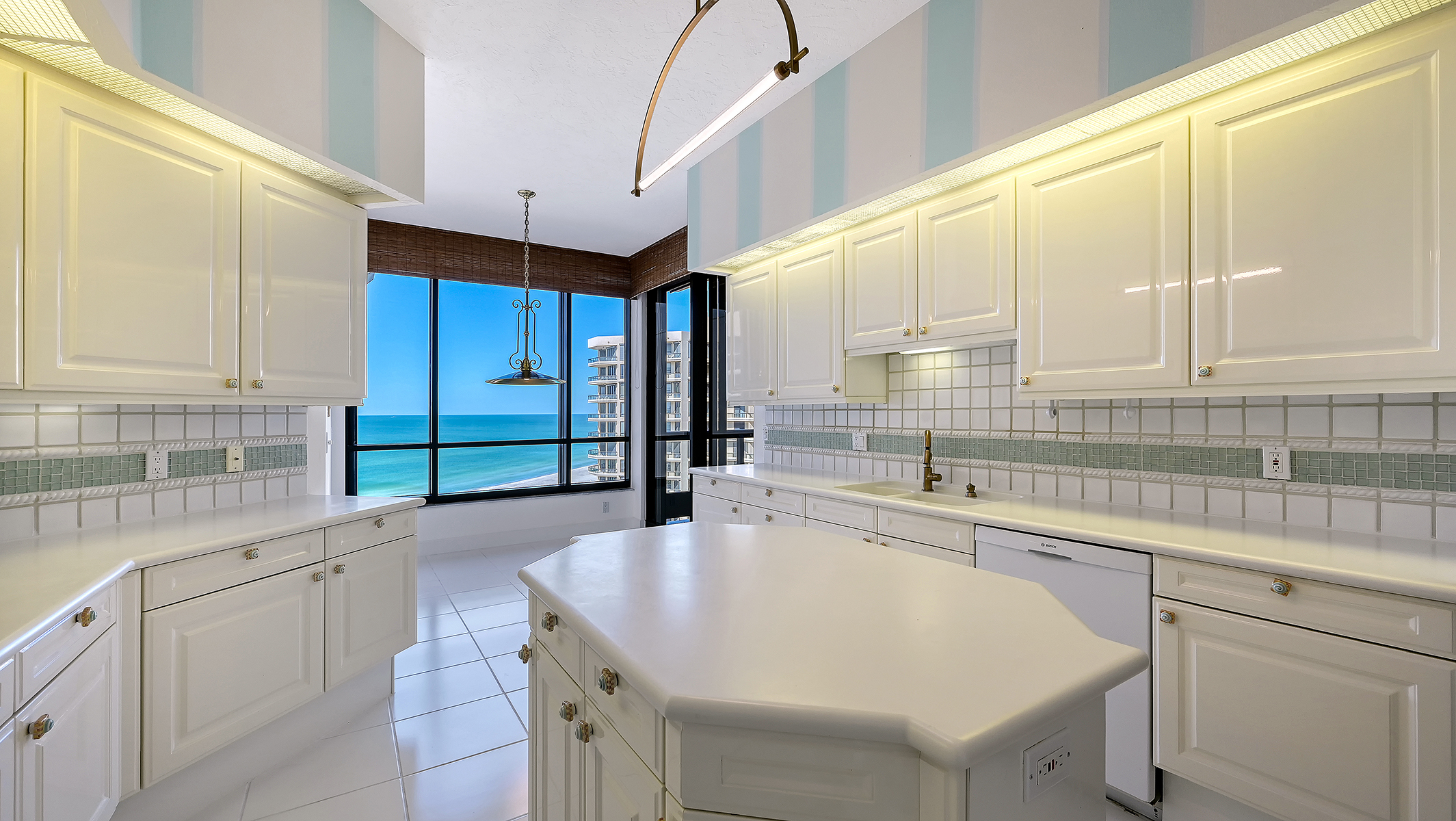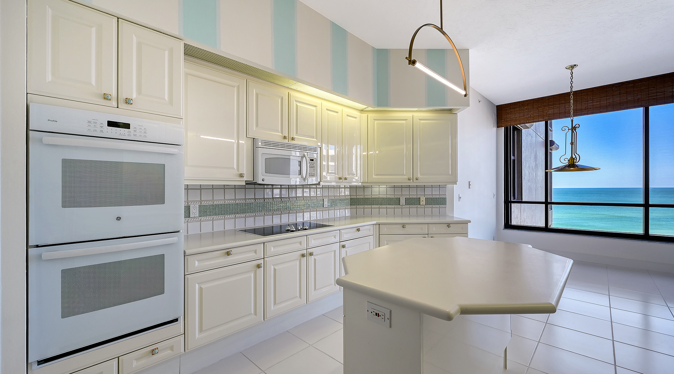 This eighth-floor Brighton residence is highly coveted for its three-bedroom configuration with panoramic vistas of the Gulf, beach, and bay from two expansive terraces. Features include ten-foot ceilings, extensive glass walls, and storm protection shutters, enhancing both comfort and sophistication. The living room is designed to maximize openness and showcase sunsets over the Gulf.