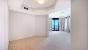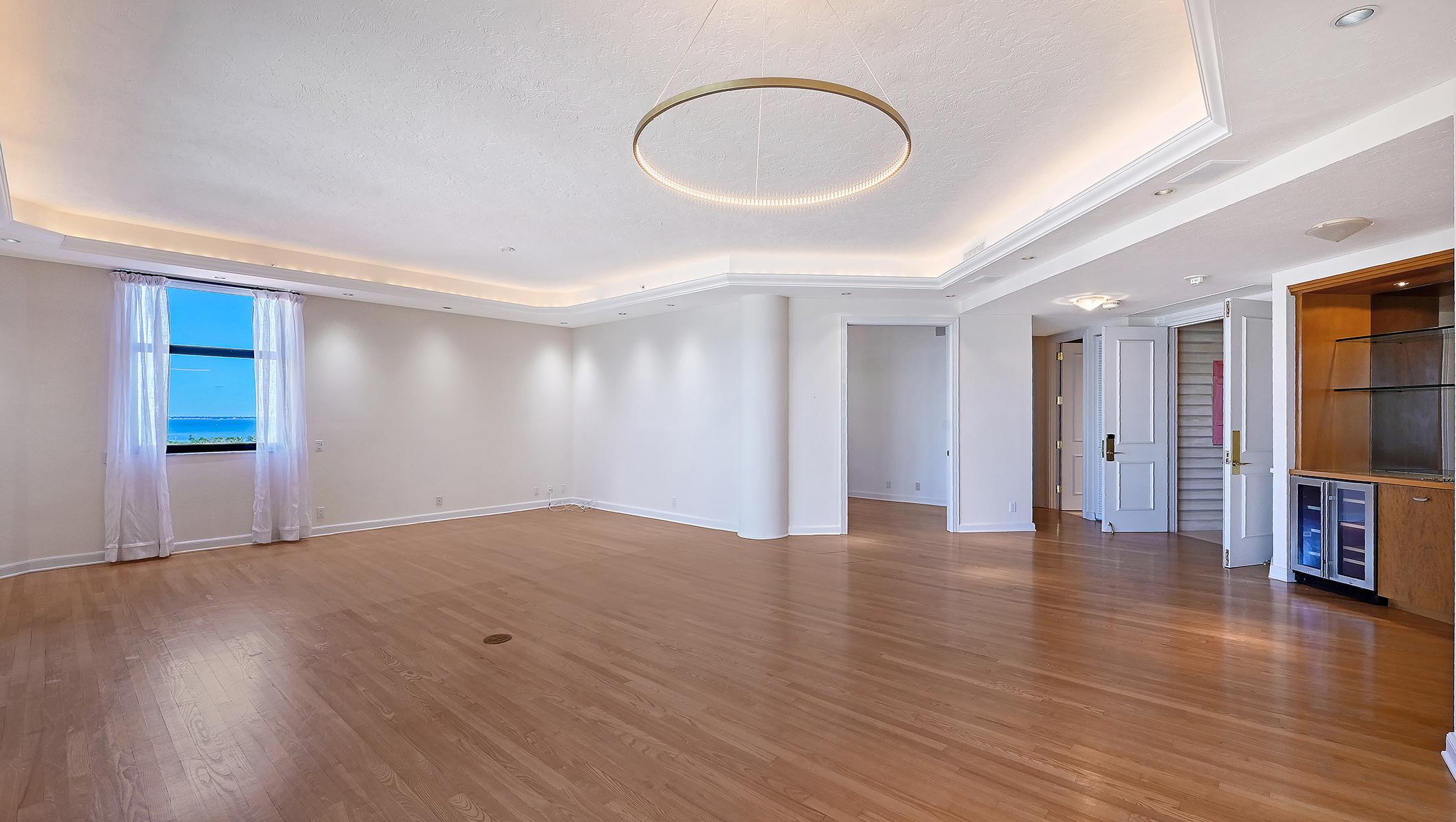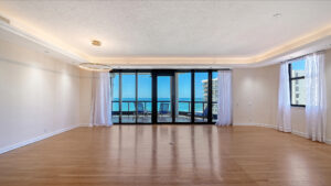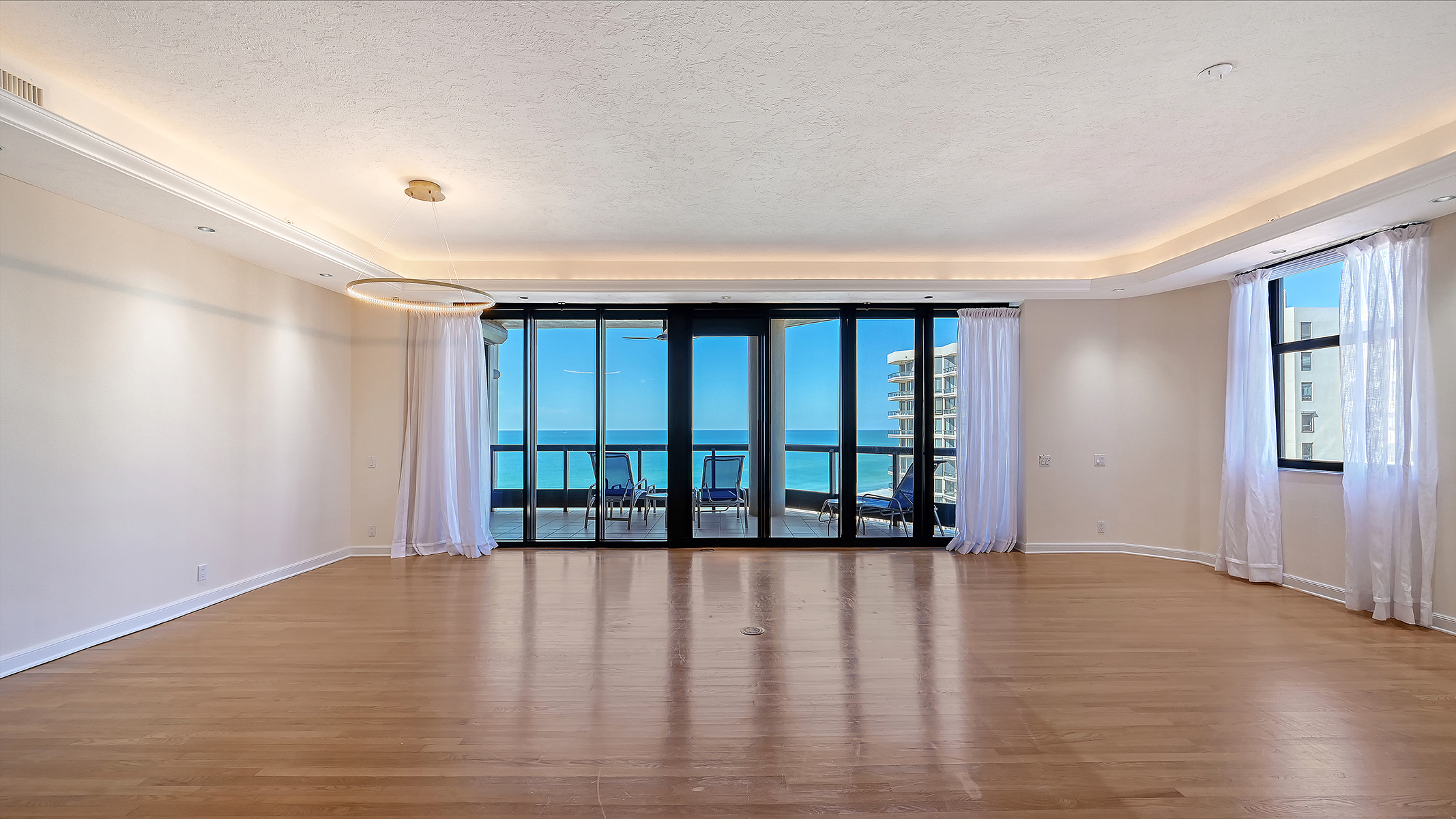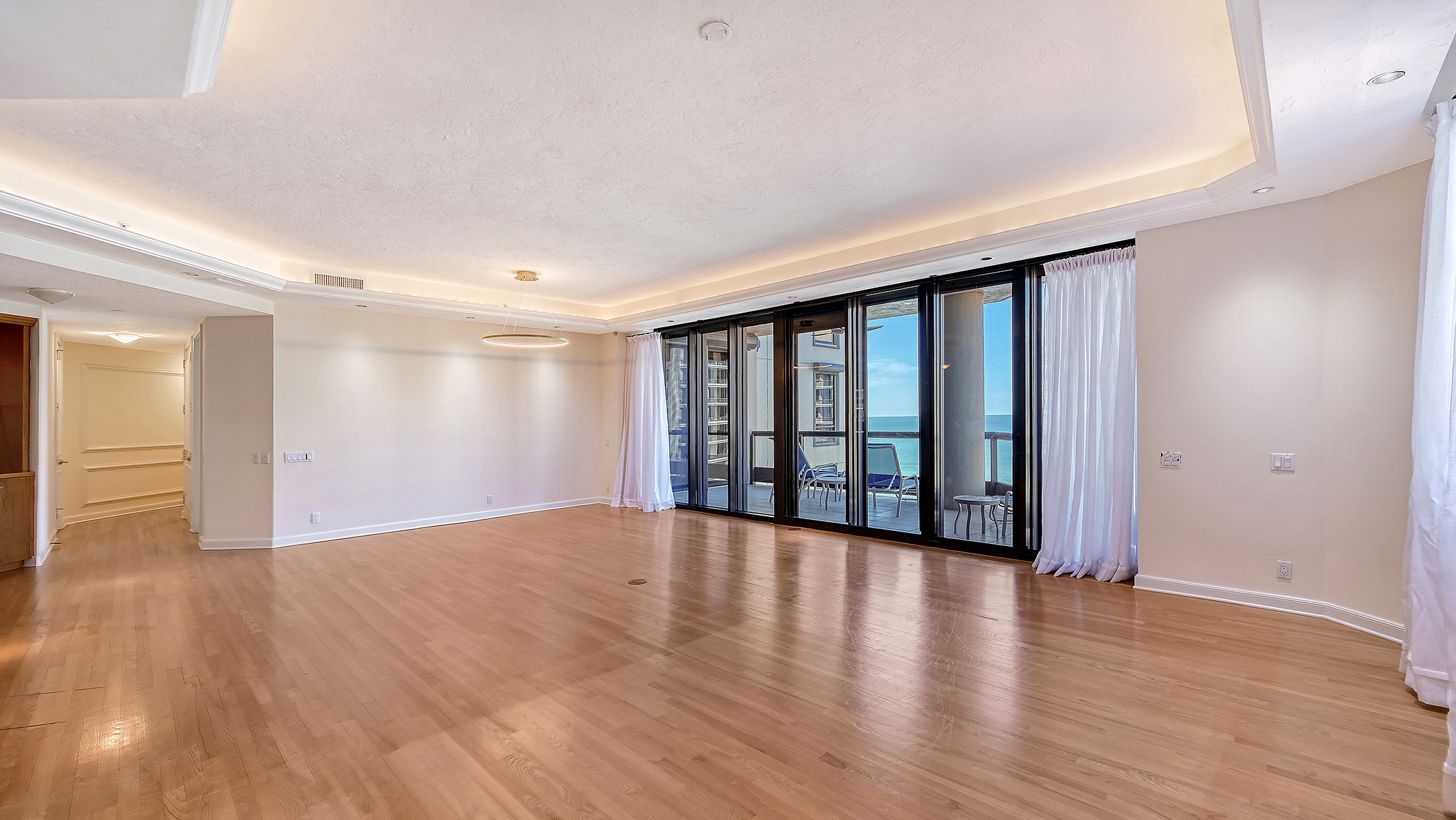 This eighth-floor Brighton residence is highly coveted for its three-bedroom configuration with panoramic vistas of the Gulf, beach, and bay from two expansive terraces. Features include ten-foot ceilings, extensive glass walls, and storm protection shutters, enhancing both comfort and sophistication. The living room is designed to maximize openness and showcase sunsets over the Gulf.