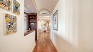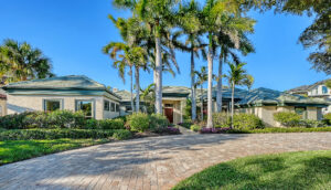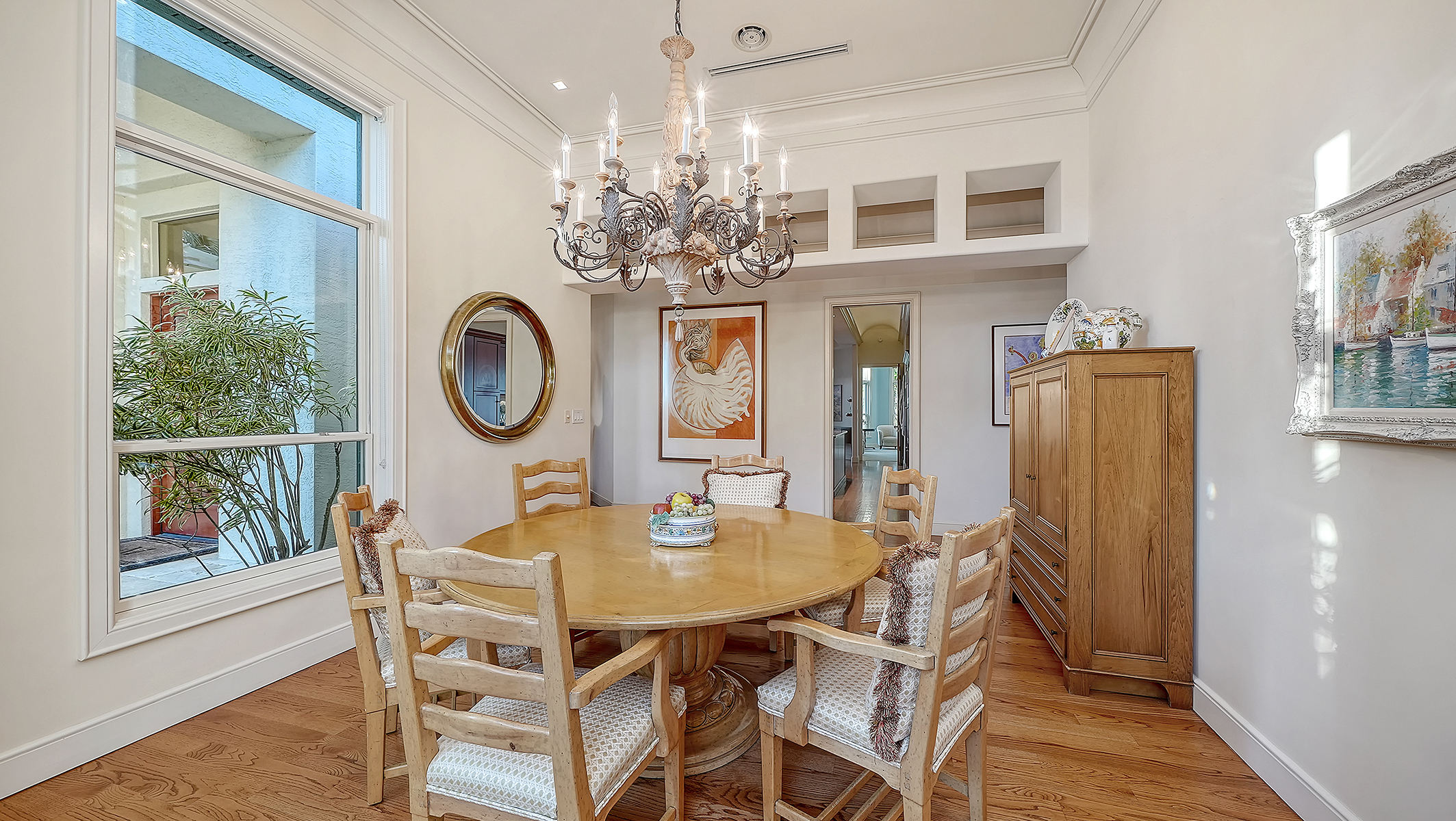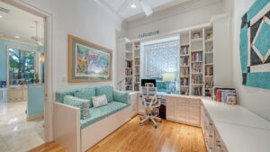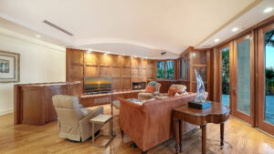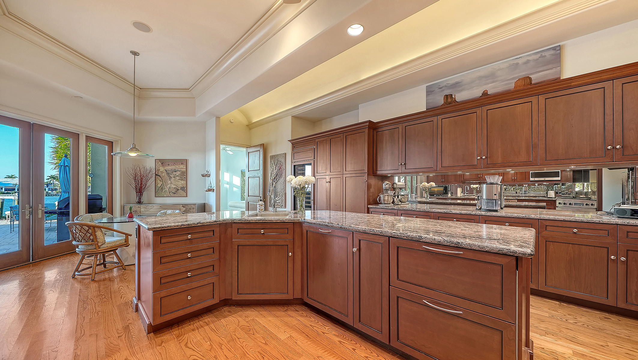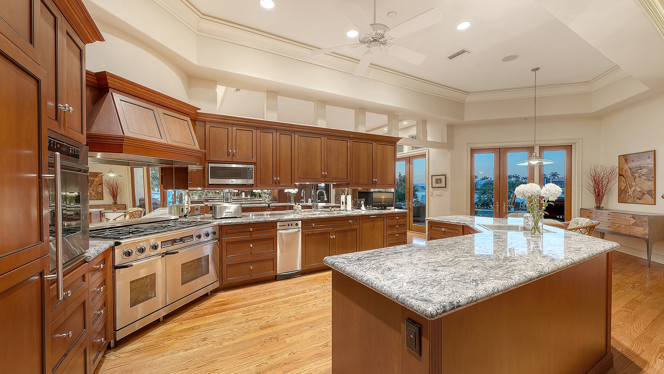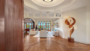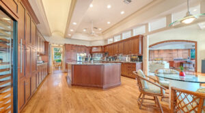 The chef’s kitchen is equally impressive, appointed with premium appliances, a six-burner Dacor gas range with dual ovens, rich cherry cabinetry, a central island, and a Sub-Zero wine refrigerator—ideal for hosting unforgettable gatherings. Outside, a circular paver driveway, mature tropical landscaping, and stately Royal Palms create a grand first impression.
