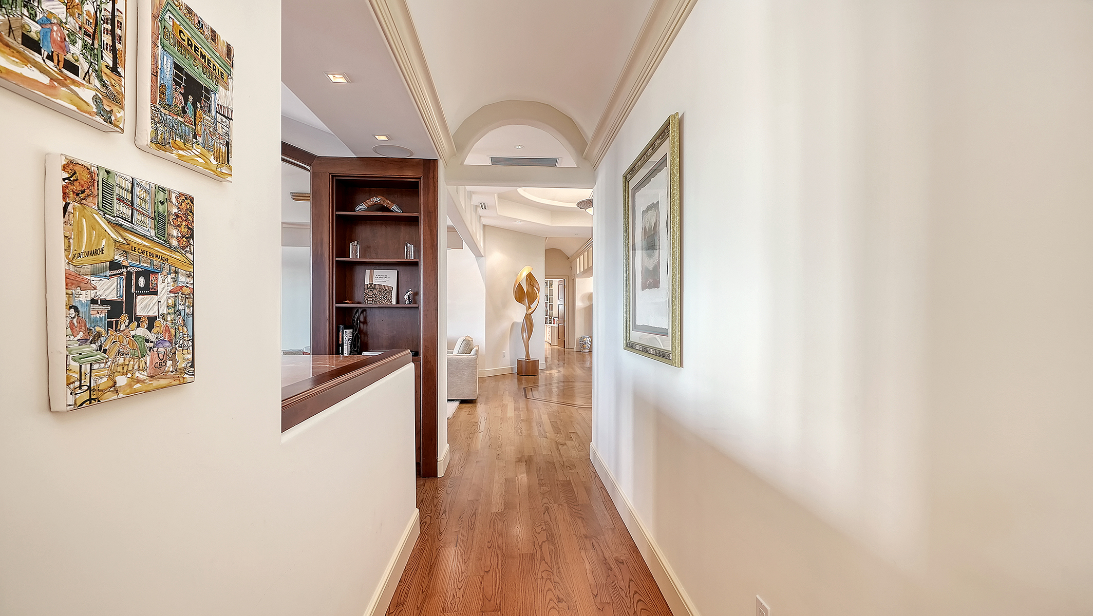 Wake each morning to panoramic water views, unwind in a spa-inspired hydra-jet soaking tub framed by bay windows, and enjoy dual walk-in closets, dual vanities, and a separate glass-enclosed shower. Rich oak floors, a welcoming fireplace, and custom cherry-wood cabinetry add warmth and sophistication throughout the open-concept living spaces.
