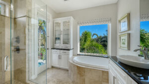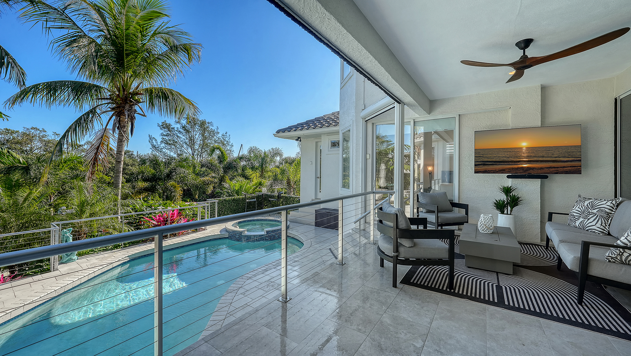 An elevator services all three levels, ensuring ease and comfort throughout the home. Step outside to enjoy the saltwater, heated pool and spa, a retractable screened lanai, and mature plantings that enhance the outdoor living experience.