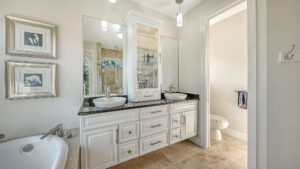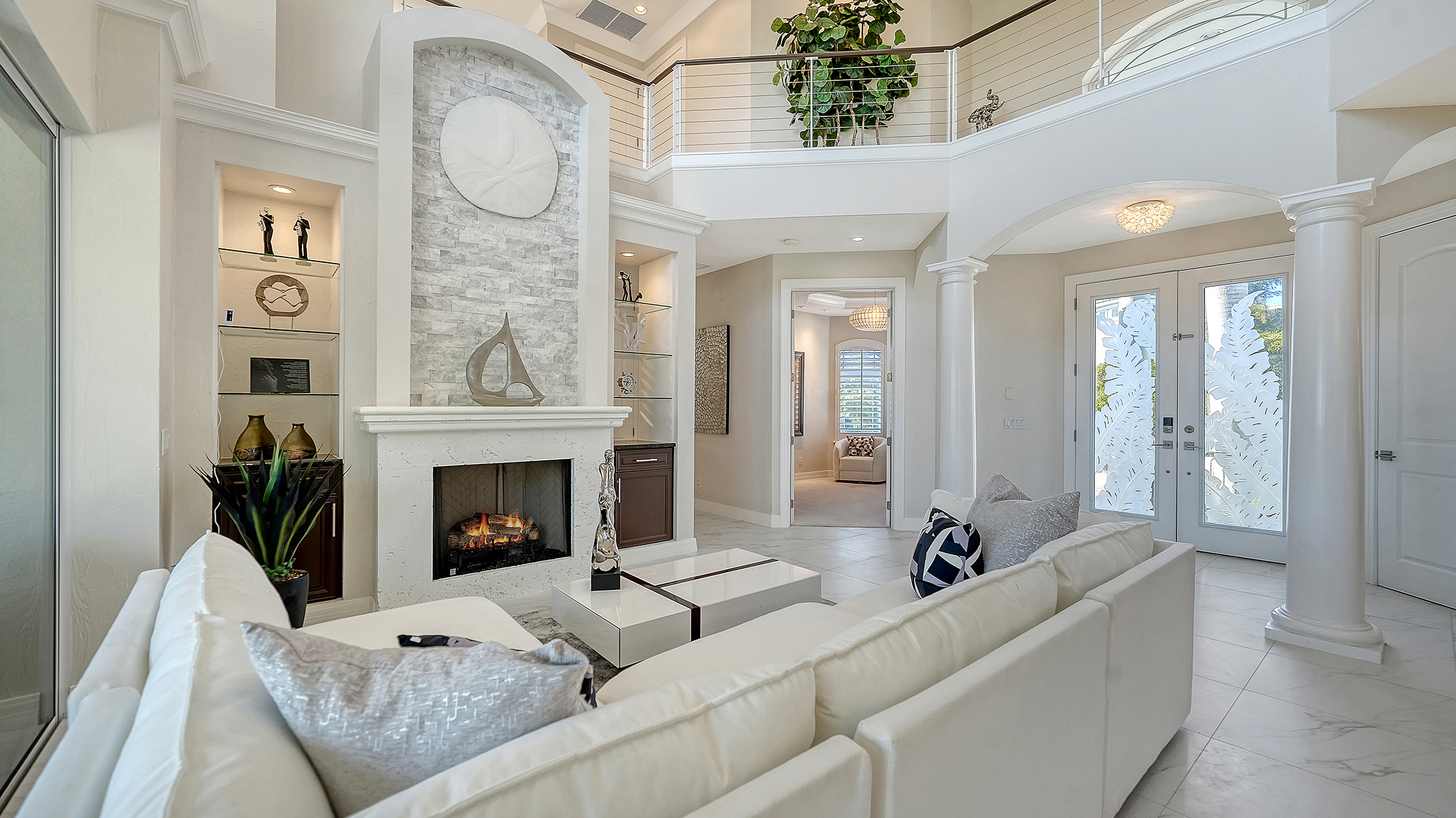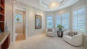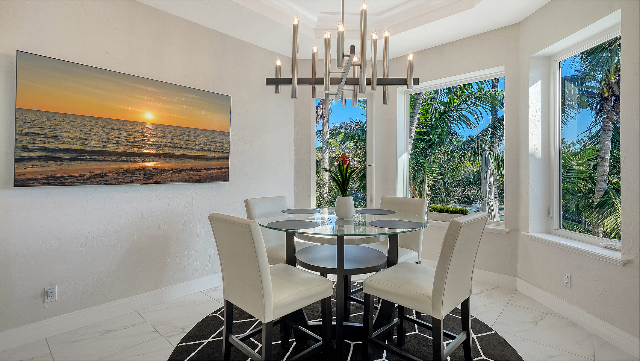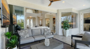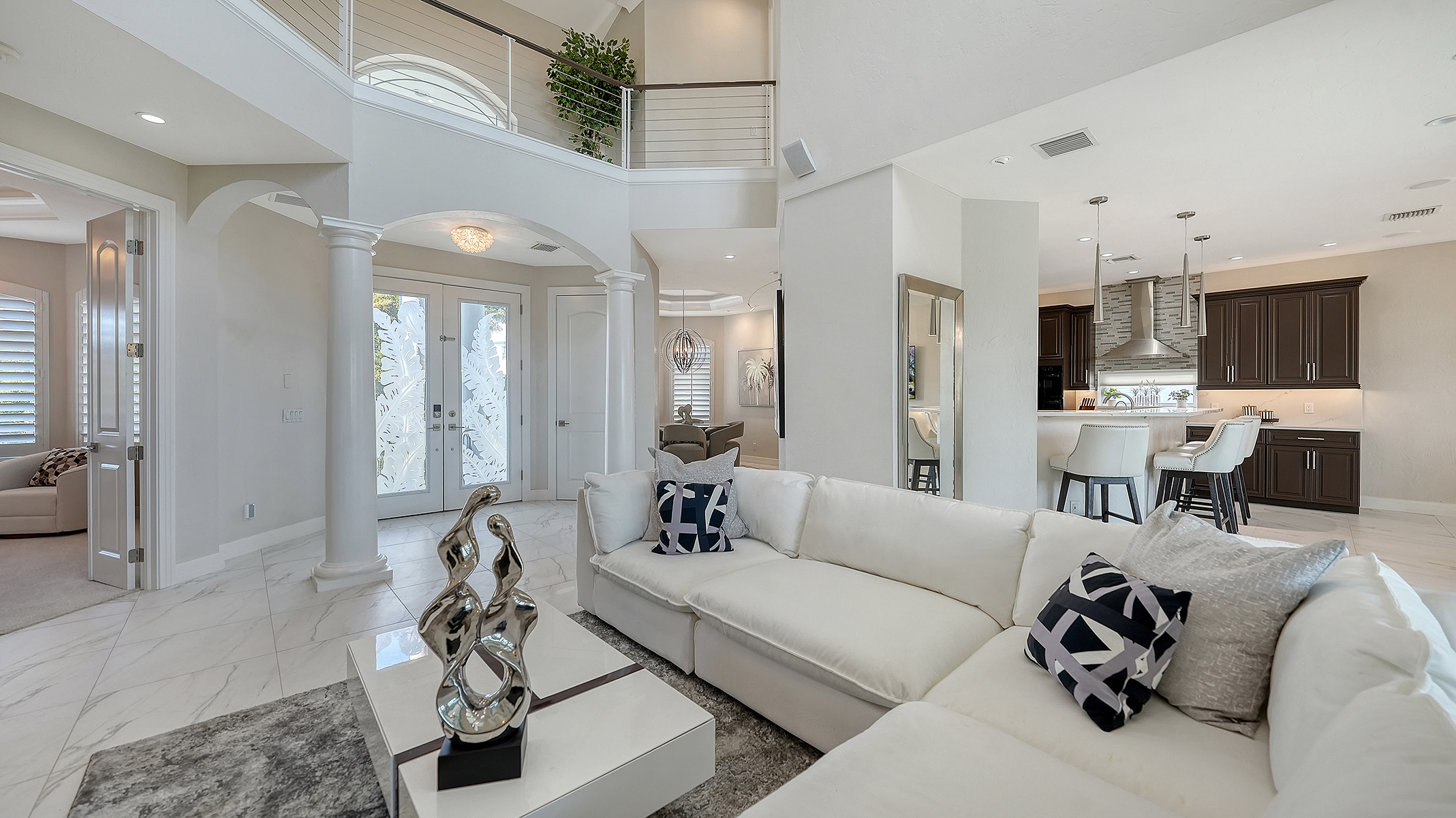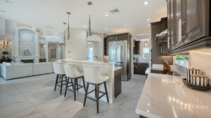 Upon entering, a wall of windows and soaring ceilings fill the great room with an abundance of natural light. The open-concept floor plan flows into a recently updated kitchen, which showcases quartz countertops, new appliances, a butler’s pantry, and both casual and formal dining areas.