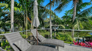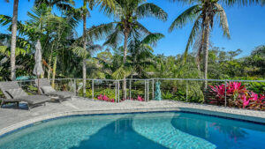 The property boasts a spacious pool and hot tub area, ideal for relaxation and entertaining. Situated amongst lush tropical landscaping, the home is its own private oasis.